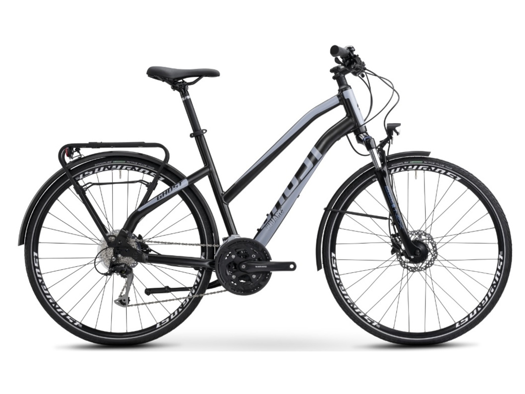 Všestranné a sportovní kolo s moderním městským designem na lehkém hliníkovém rámu osazeno hydraulickou vidlicí SR Suntour NEX, řazením Shimano Altus s 3×9 převody a spolehlivými brzdami Shimano BR-MT200. GHOST Square Trekking Essential. | GHOST Square Trekking Essential je maximálně funkční a spolehlivé kolo, vybavené vším, co potřebujete pro každodenní jízdu. V elegantních barvách a jednoduchém a čistém vzhledu dokáže zaujmout na první pohled. S kvalitní výbavou, ke které mimo jiné patří nábojové dynamo pohánějící LED osvětlení, blatníky a speciálně navrženým nosičem je jízda nejen bezpečná, ale také praktická! Verze Ladies má navíc sníženou horní rámovou trubku pro pohodlný výstup a nástup. A pokud to všechno nestačí, promyšlená geometrie přesvědčí ty, kteří chtějí víc – absolutně pohodlný a extrémně hladký chod.