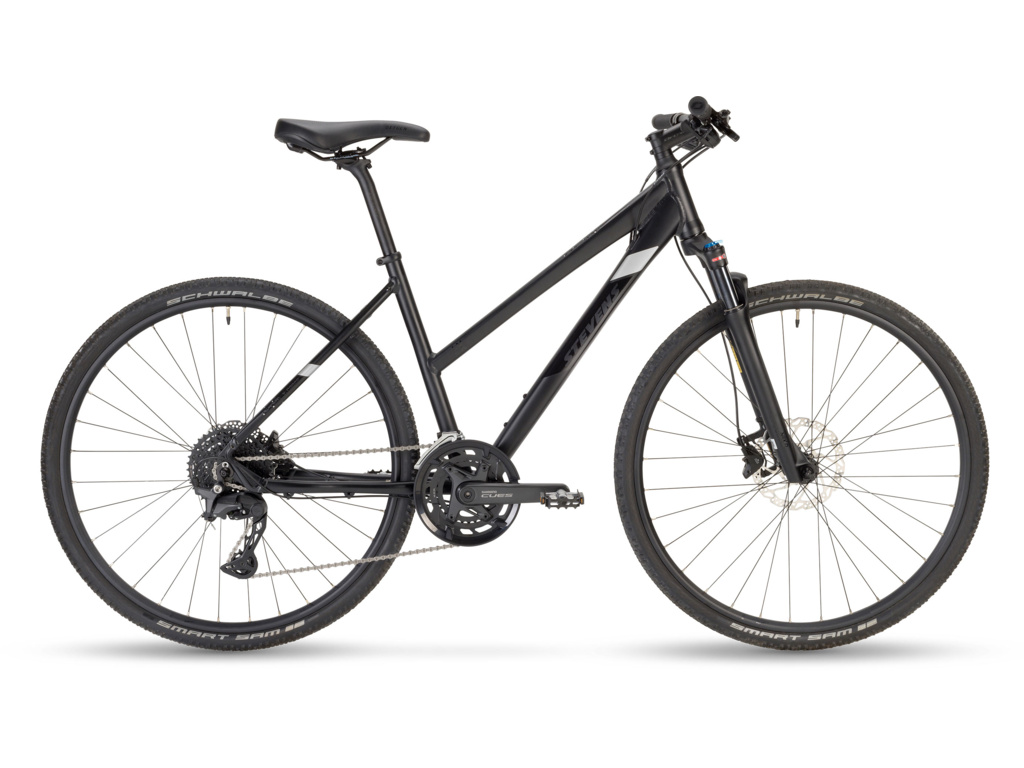 Vyvážené crossové kolo STEVENS 6X s kvalitní výbavou, odpruženou vidlicí, pohonem Shimano CUES 2×10 a hydraulickými brzdami. Skvěle se hodí pro trénink, výlety i každodenní použití – k dispozici ve dvou typech rámu. | STEVENS 6X je moderní krosové kolo, které spojuje výbornou funkčnost, komfort a spolehlivost. Lehký hliníkový rám 6061 TB s trojitě zeslabovanými trubkami je dostupný v devíti velikostech ve variantě s klasickým rámem (HT) i sníženým nástupem (LT) – pro maximální přizpůsobení každému jezdci.O pohodlnou jízdu i na horších cestách se stará vidlice SR Suntour NRX-D LO se zdvihem 63 mm, olejovým tlumením a robustními 30mm vnitřními nohami. Pohon Shimano CUES U6000 2×10 s technologií Linkglide zaručuje tiché, přesné a odolné řazení. Převodník 46/30 zubů a kazeta 11–39 poskytují široký rozsah pro roviny i kopce.Brzdný výkon zajišťují spolehlivé hydraulické kotoučové brzdy Shimano BR-MT410 s kotouči 180/160 mm. Kolo je obuto do univerzálních plášťů Schwalbe Smart Sam v šířce 42 mm, které zvládnou asfalt i zpevněné cesty s jistým záběrem a minimálním valivým odporem. Hlavní přednosti: Lehký hliníkový rám 6061 TB ve variantě HT i LT SR Suntour odpružená vidlice s robustní konstrukcí a olejovým tlumením Shimano CUES U6000 2×10 Linkglide – plynulé a trvanlivé řazení Hydraulické brzdy Shimano BR-MT410 – jisté a účinné brzdění Pláště Schwalbe Smart Sam 42 mm – univerzální volba pro asfalt i šotolinu Pohodlný a ergonomický kokpit Oxygen Driver Hmotnost 12,9 kg, barva Stealth Black